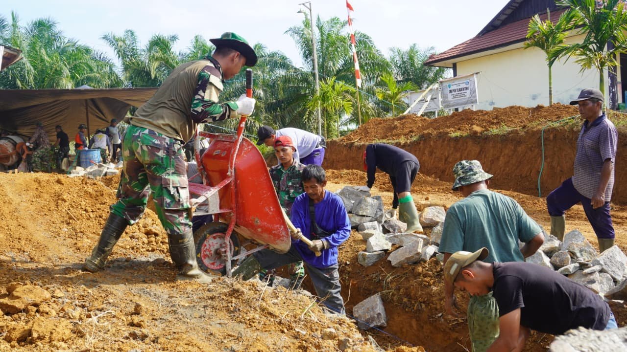 Kotawaringin Timur – Alat dorong satu roda atau arco menjadi sarana penting yang digunakan anggota Satgas TNI Manunggal Membangun Desa (TMMD) ke-127 Kodim 1015/Sampit dalam pengerjaan pembangunan siring badan jalan di Desa Tribuana, Kecamatan Telaga Antang, Kabupaten Kotawaringin Timur, Kamis (12/02/2026).