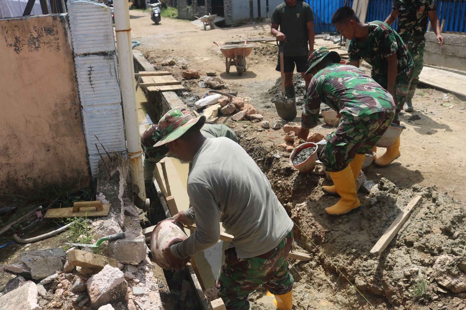 Bersama masyarakat, para prajurit bekerja bahu-membahu menata saluran air demi menciptakan lingkungan yang lebih tertib dan sehat. Proyek ini menjadi solusi atas persoalan genangan yang kerap muncul saat curah hujan tinggi.