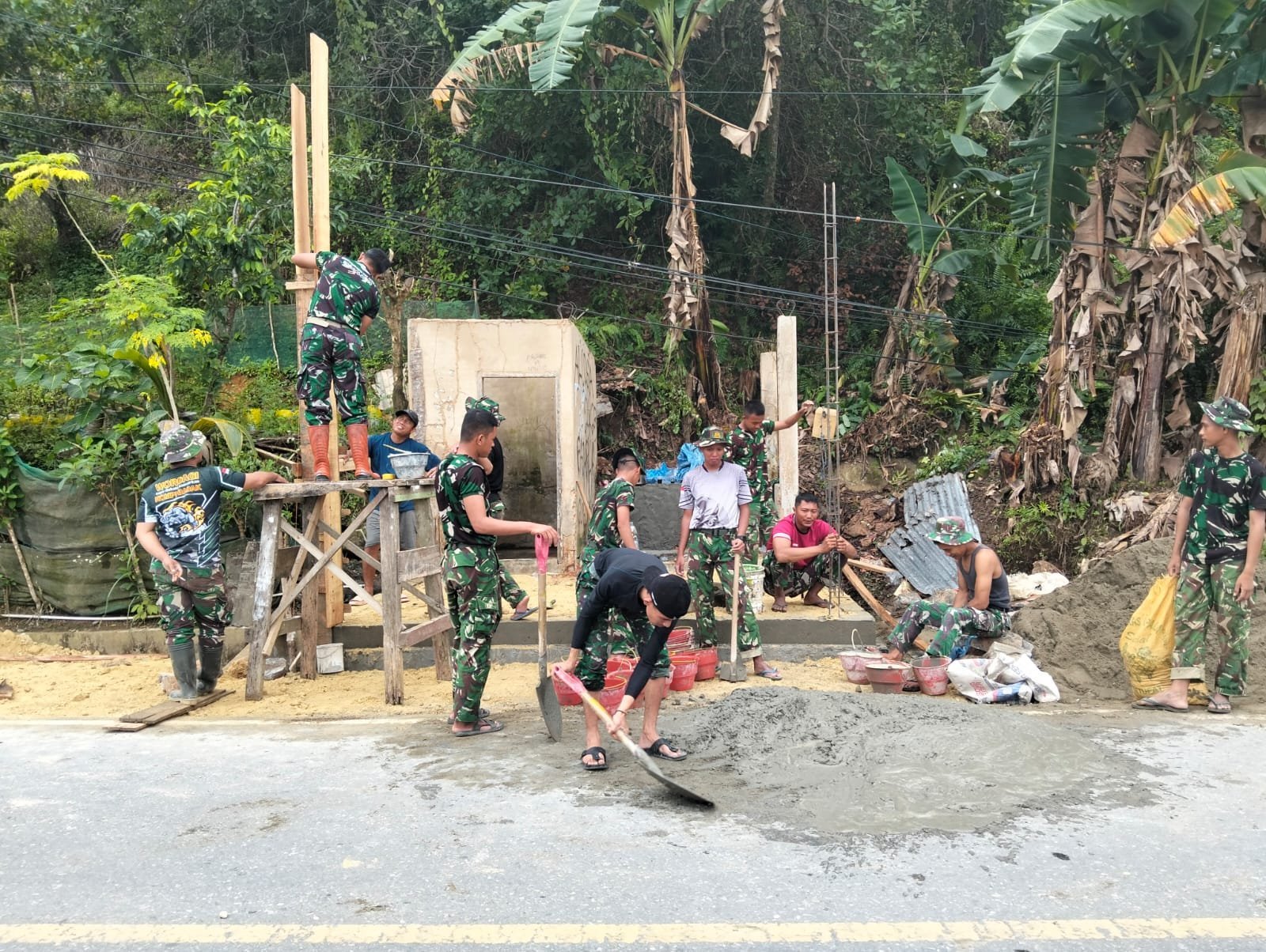 Personel Satgas bersama masyarakat terlihat bekerja kompak memasang tiang mal sebagai bagian dari tahapan awal pembangunan fasilitas MCK. Proses tersebut dilakukan dengan penuh kehati-hatian agar konstruksi dapat berdiri stabil dan aman digunakan masyarakat.