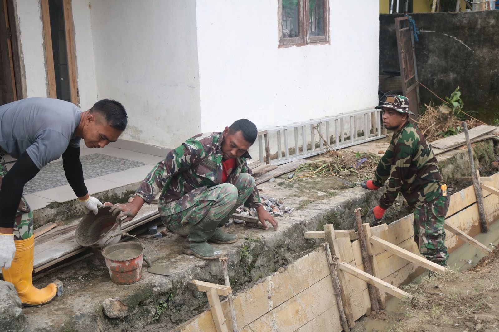 Personel Satgas TMMD bersama warga setempat terlihat bekerja sama dalam proses pengerjaan drainase. Kolaborasi tersebut mempercepat proses pembangunan sekaligus memperkuat semangat gotong royong di tengah masyarakat.