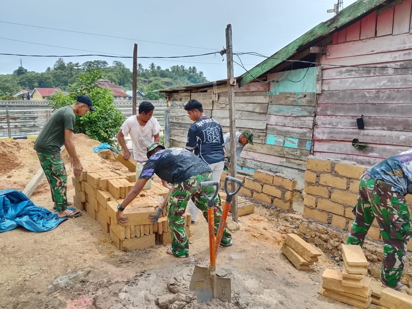 Personel Satgas bersama warga tampak kompak melanjutkan pemasangan dinding batako sebagai bagian penting dalam proses rehabilitasi rumah. Tahapan ini menjadi fondasi utama untuk menciptakan hunian yang lebih aman dan sehat bagi keluarga penerima manfaat.