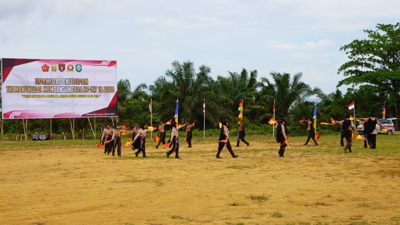 Kotawaringin Timur – Penutupan program TNI Manunggal Membangun Desa (TMMD) Reguler ke-127 Kodim 1015/Sampit di Desa Tri Buana, Kecamatan Telaga Antang, Kabupaten Kotawaringin Timur berlangsung meriah dengan berbagai pertunjukan seni dan atraksi budaya, Rabu (11/03/2026).