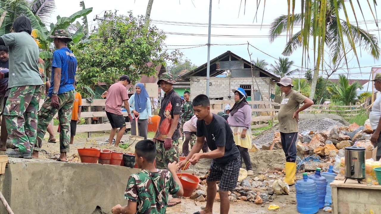 Kolaborasi antara prajurit berseragam loreng dan masyarakat dengan pakaian keseharian menciptakan sinergi yang harmonis dalam menyelesaikan sasaran fisik TMMD.