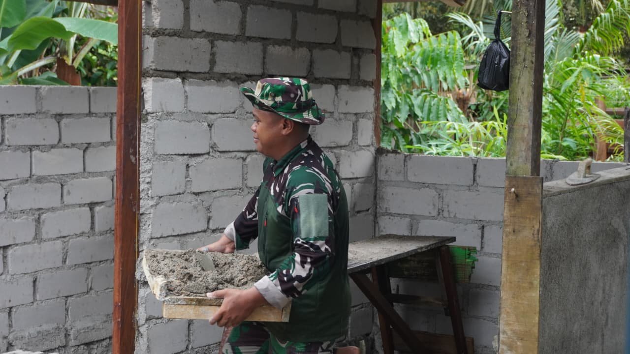 Kegiatan tersebut dilakukan secara gotong royong dengan penuh semangat kebersamaan. Prajurit TNI dan masyarakat tampak kompak menyusun batako satu per satu agar konstruksi bangunan berdiri kokoh dan rapi.