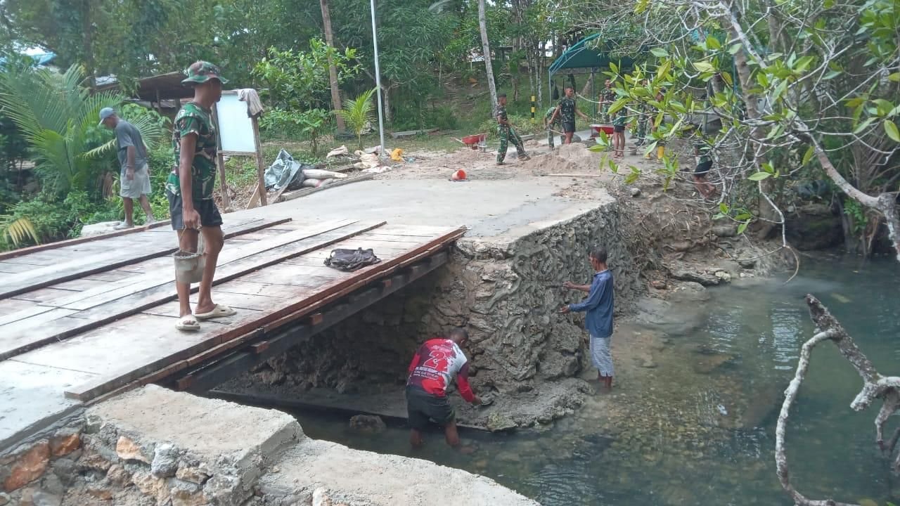Pada Sabtu (07/03/2026), Satgas TMMD bersama masyarakat melaksanakan pengecoran lantai pada bagian ujung jembatan guna meratakan pertemuan antara jembatan dan badan jalan.