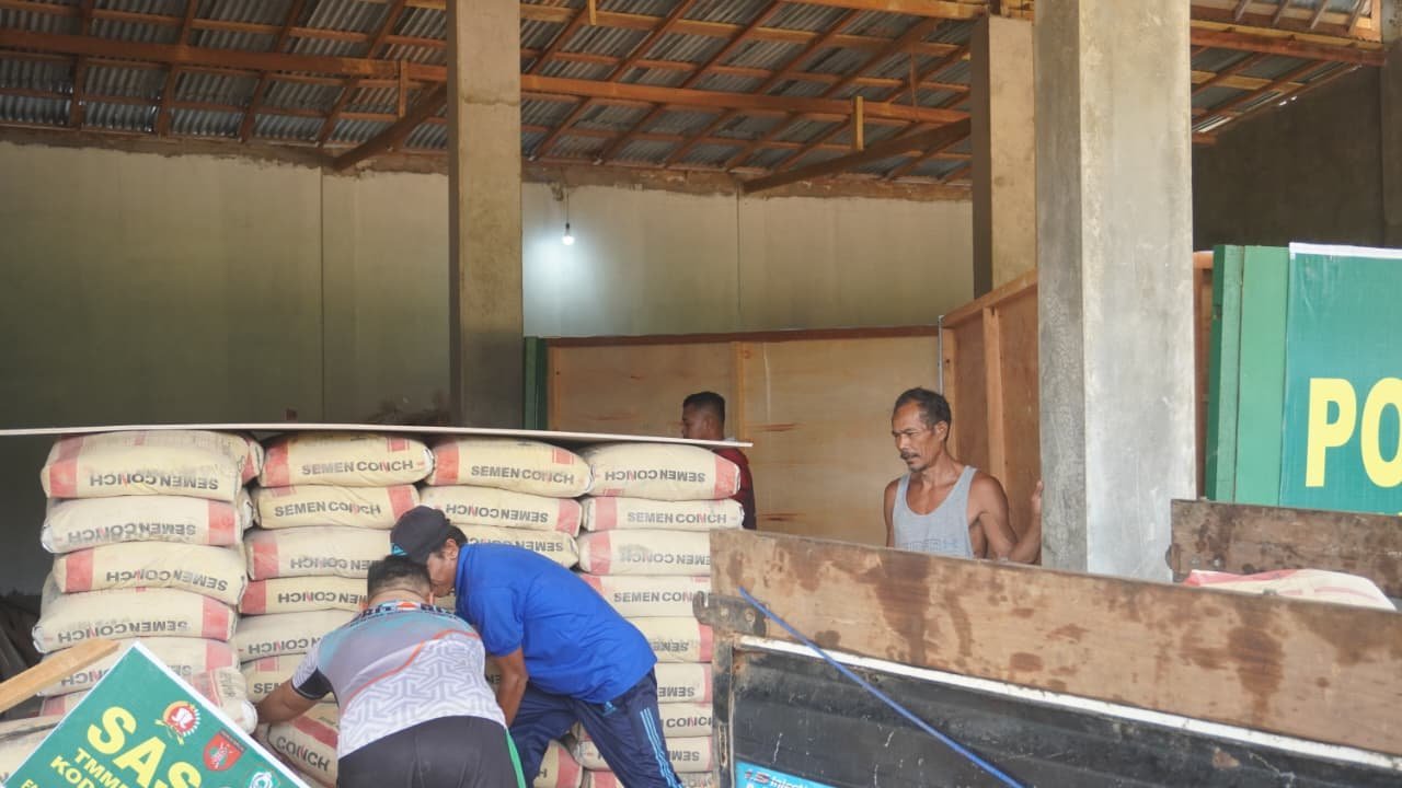 Menggunakan kendaraan pickup, semen diantar langsung ke lokasi sasaran fisik. Setelah tiba, anggota Satgas bersama warga bahu-membahu menurunkan dan menyusun material agar siap digunakan.