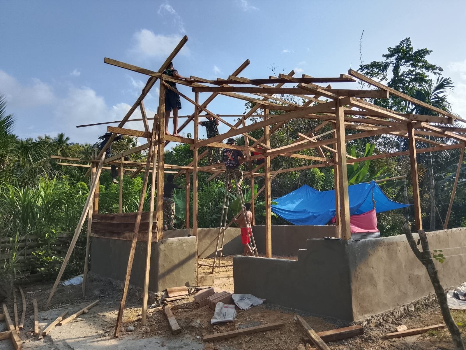 Personel Satgas TMMD bersama masyarakat setempat bahu-membahu mengangkat dan memasang balok-balok kayu di bagian atas dinding bangunan sebagai rangka atap rumah.