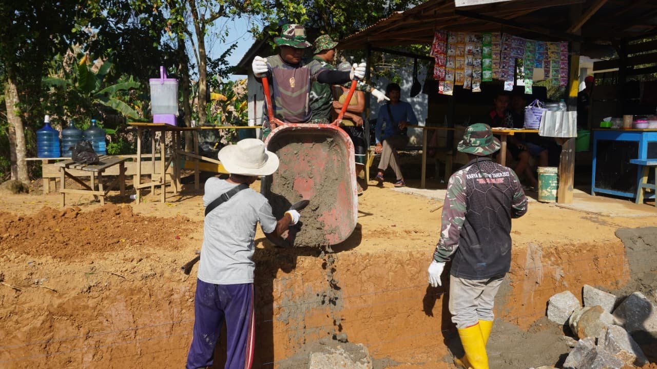 Salah satu anggota Satgas TMMD, Kopda Kasmin, menunjukkan kemampuannya dalam menggunakan arco untuk mengangkut adukan semen. Dengan alat tersebut, material dapat dipindahkan secara lebih cepat menuju lokasi pembangunan siring jalan.