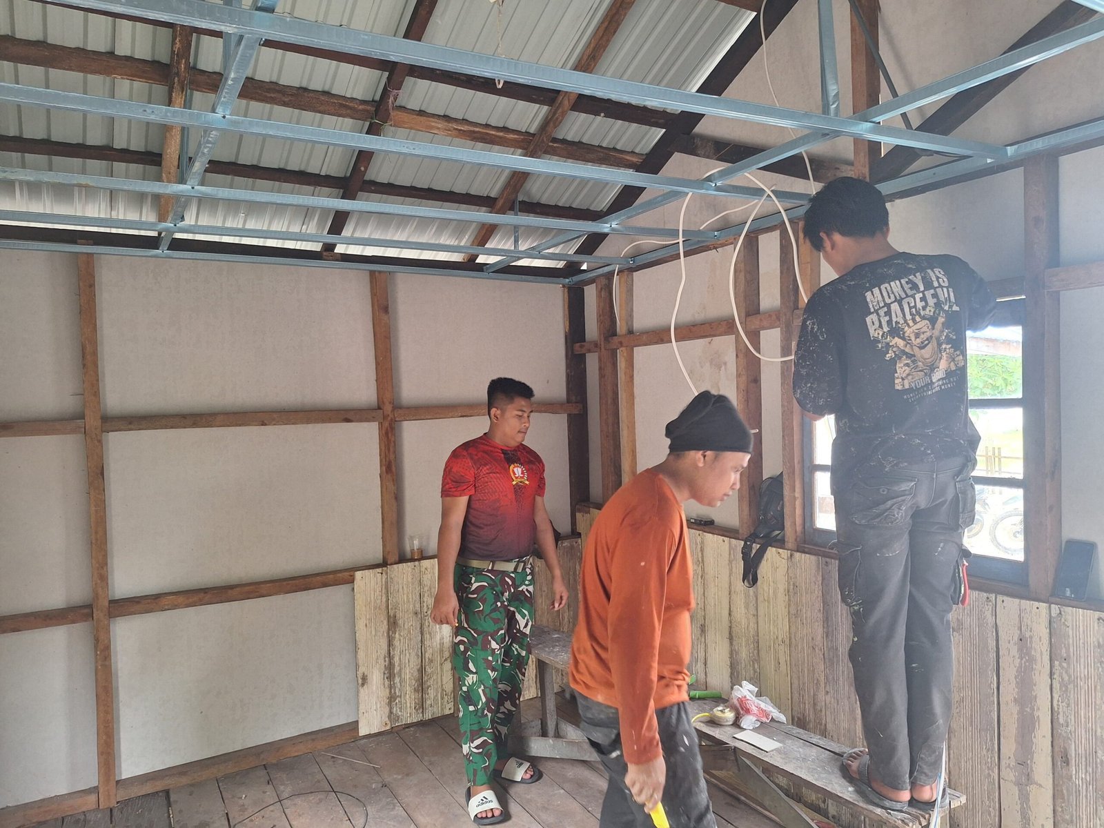 Dengan bantuan lampu, Satgas dan warga tetap dapat bekerja lembur memperbaiki rumah warga meski sudah malam. Aktivitas ini menunjukkan dedikasi tinggi dan semangat gotong royong tanpa mengenal batas waktu.