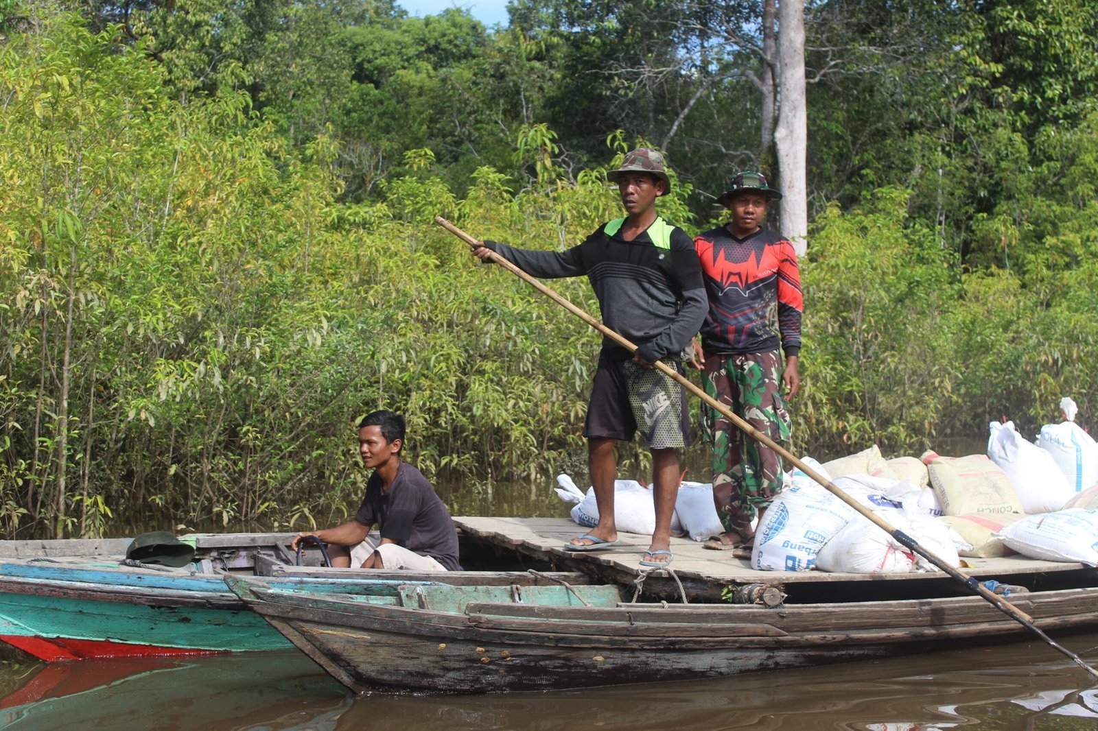 Material seperti pasir, batu, dan semen diangkut melalui jalur sungai menggunakan klotok dari titik distribusi utama menuju lokasi pekerjaan jalan. Metode ini dinilai paling efektif mengingat akses darat yang belum memungkinkan untuk dilalui truk atau alat berat secara langsung.