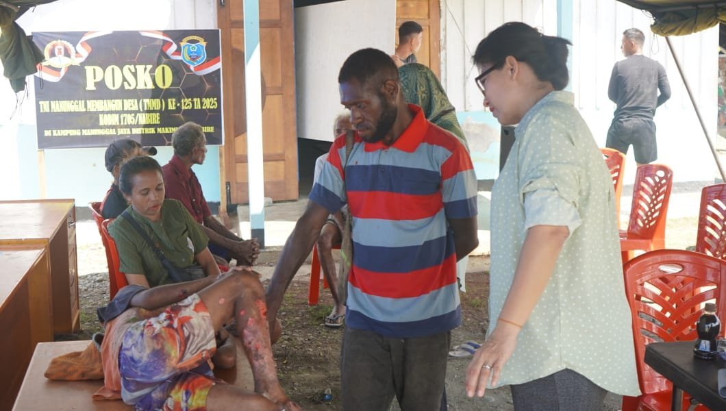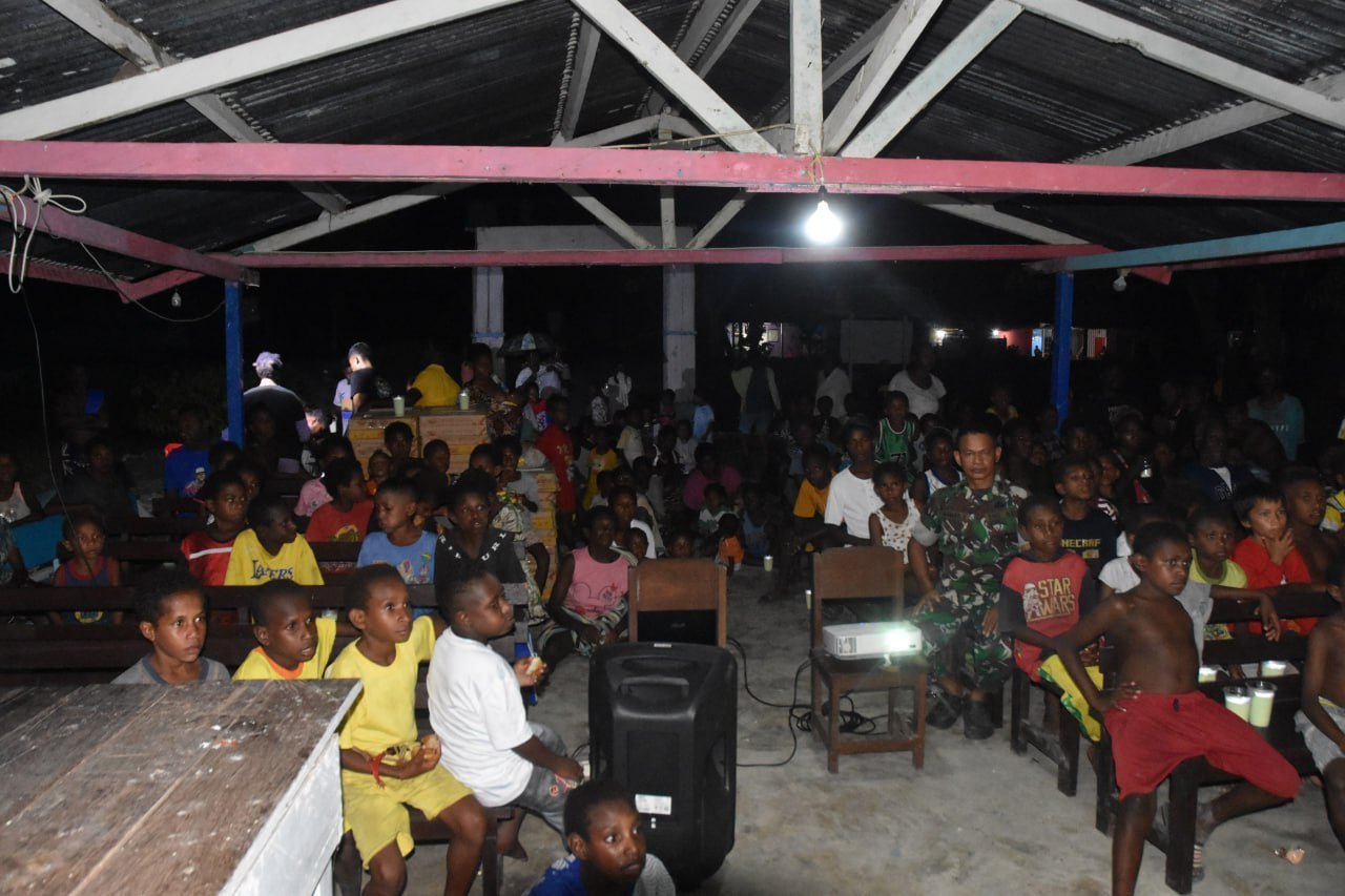 Suasana kebersamaan tampak kental saat Satuan Tugas (Satgas) TNI Manunggal Membangun Desa (TMMD) ke-124 Kodim 1710/Mimika menggelar kegiatan nonton bareng (nobar) film pembangunan bersama warga, di Kampung Pigapu, Distrik Iwaka, Sabtu malam (31/5/2025).
