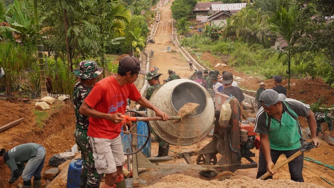 Kotawaringin Timur – Satgas TMMD Reguler ke-127 bersama warga memanfaatkan mesin molen untuk meningkatkan efisiensi pengerjaan pembangunan siring badan jalan, Sabtu (14/02/2026).