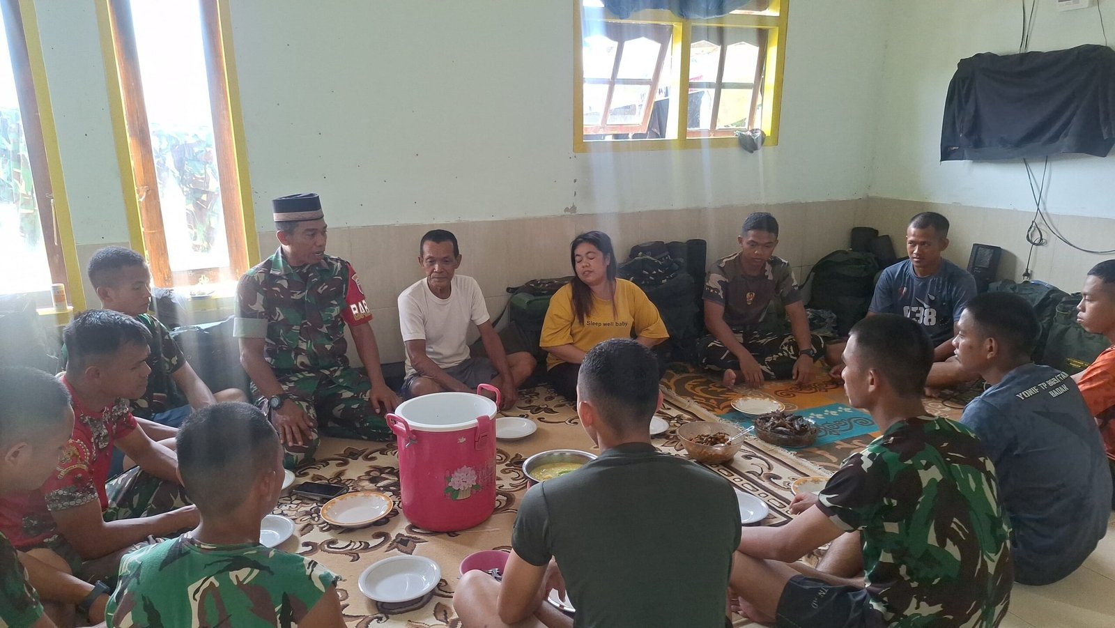 Momen istirahat tersebut dimanfaatkan prajurit untuk berbaur dengan warga, duduk bersila, serta menikmati hidangan rumahan yang disajikan dengan penuh ketulusan. Interaksi sederhana ini menciptakan suasana kekeluargaan yang mempererat hubungan sosial antara aparat dan masyarakat.