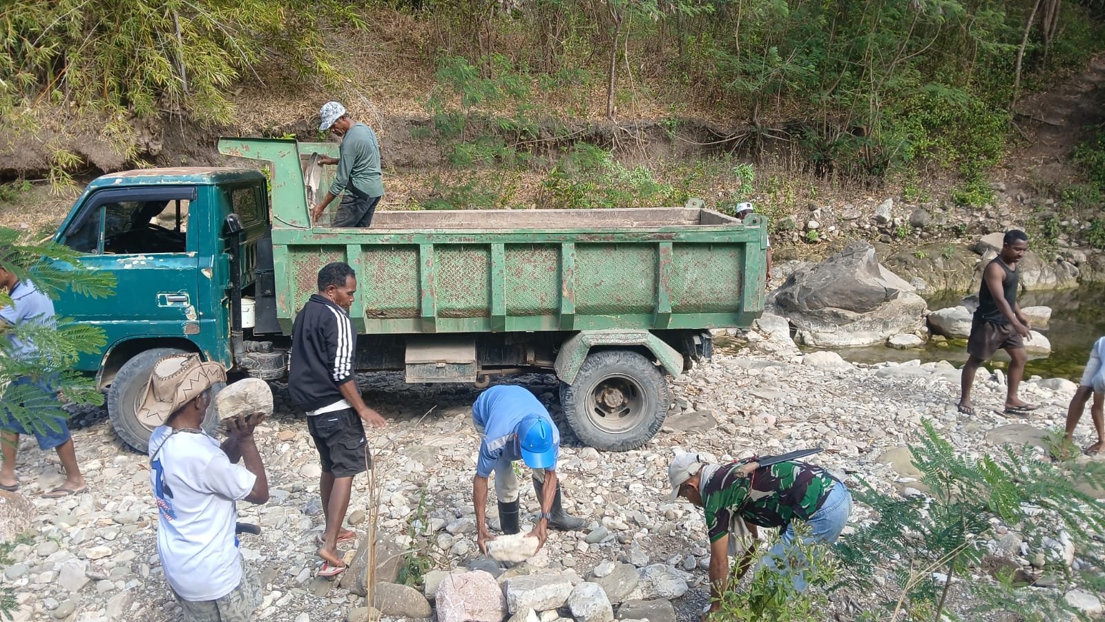 Di lokasi pembangunan jalan penghubung antardusun dan jembatan, para prajurit dan masyarakat terlihat kompak menembus hambatan alam demi menyalurkan material seperti pasir, semen, dan batu ke titik-titik pengerjaan. Tidak jarang mereka harus menggunakan alat bantu sederhana karena kendaraan tidak dapat menjangkau lokasi.