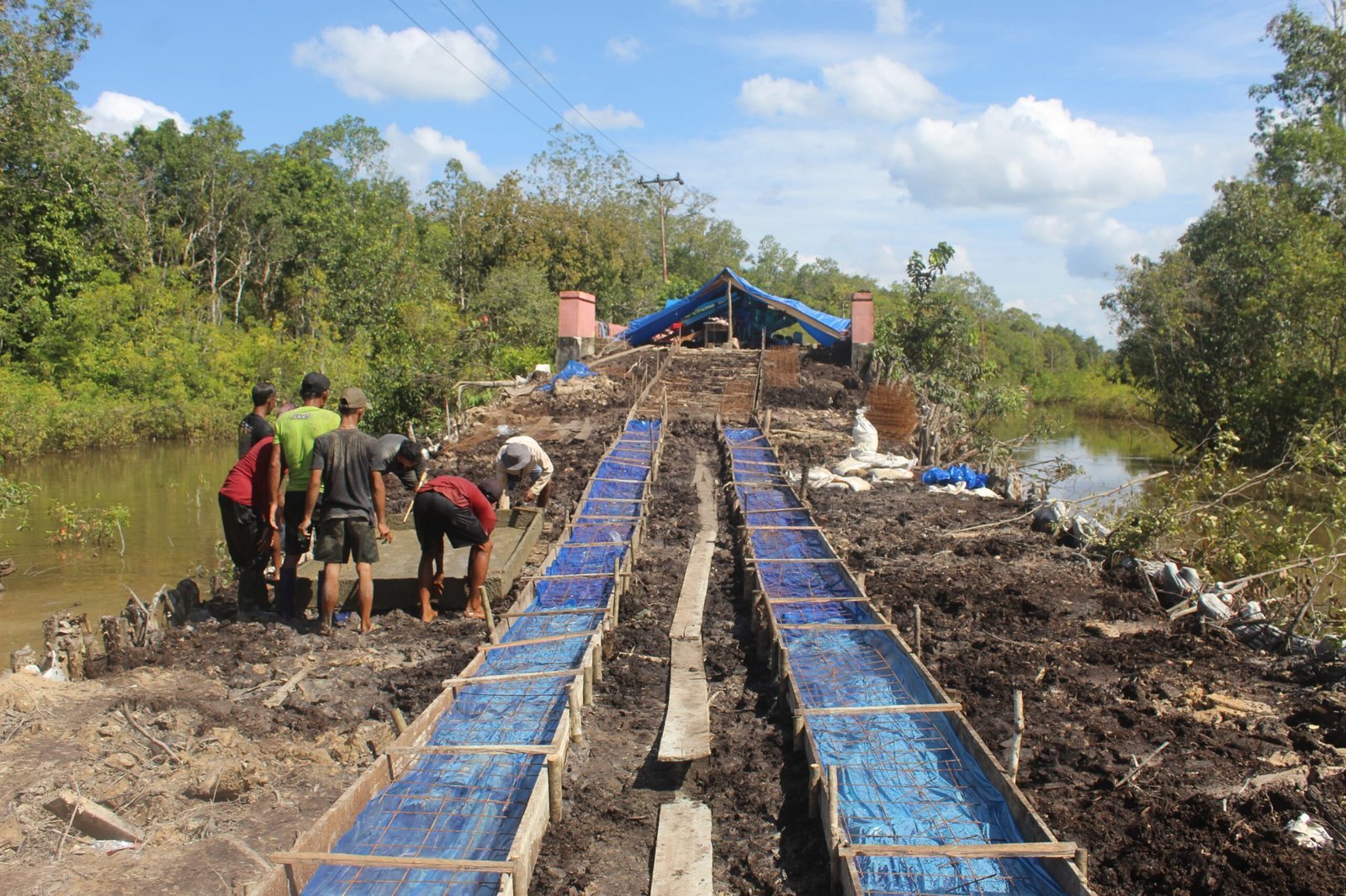 Anggota Satgas TMMD bekerja secara sistematis, mulai dari menyiapkan bekisting, menyusun besi rangka, hingga pengecoran menggunakan adukan semen yang dikerjakan secara manual bersama warga. Pengecoran bagian bawah tiang menjadi langkah awal yang penting untuk memastikan struktur menara dapat menopang beban air dalam jumlah besar dengan stabil dan aman.