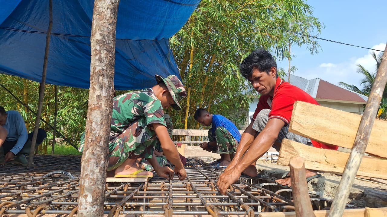 Personel TNI dan masyarakat tampak kompak merangkai struktur besi dengan penuh ketelitian. Setiap sambungan diikat dan disusun sesuai ukuran teknis agar konstruksi jembatan memiliki daya tahan yang kuat.