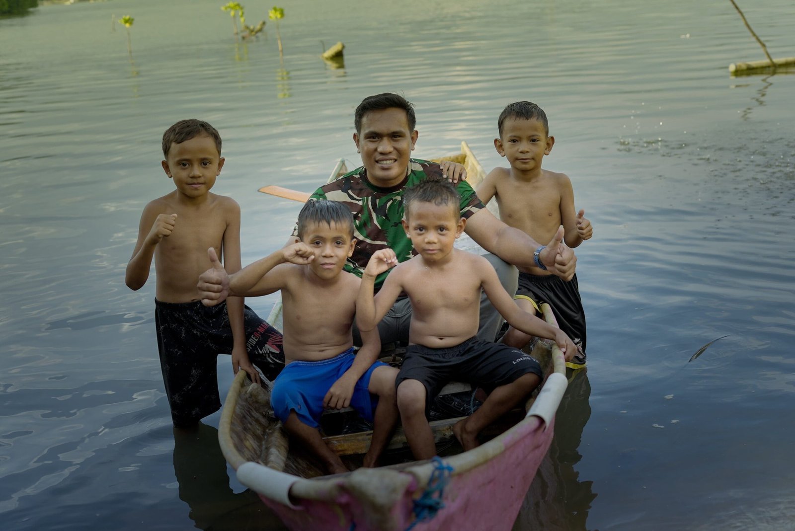 Keceriaan tampak terpancar saat anggota Satgas mengajak sejumlah bocah menyusuri perairan menggunakan perahu kayu tradisional. Tawa riang dan antusiasme anak-anak menjadi warna tersendiri di tengah aktivitas pembangunan yang tengah berlangsung.