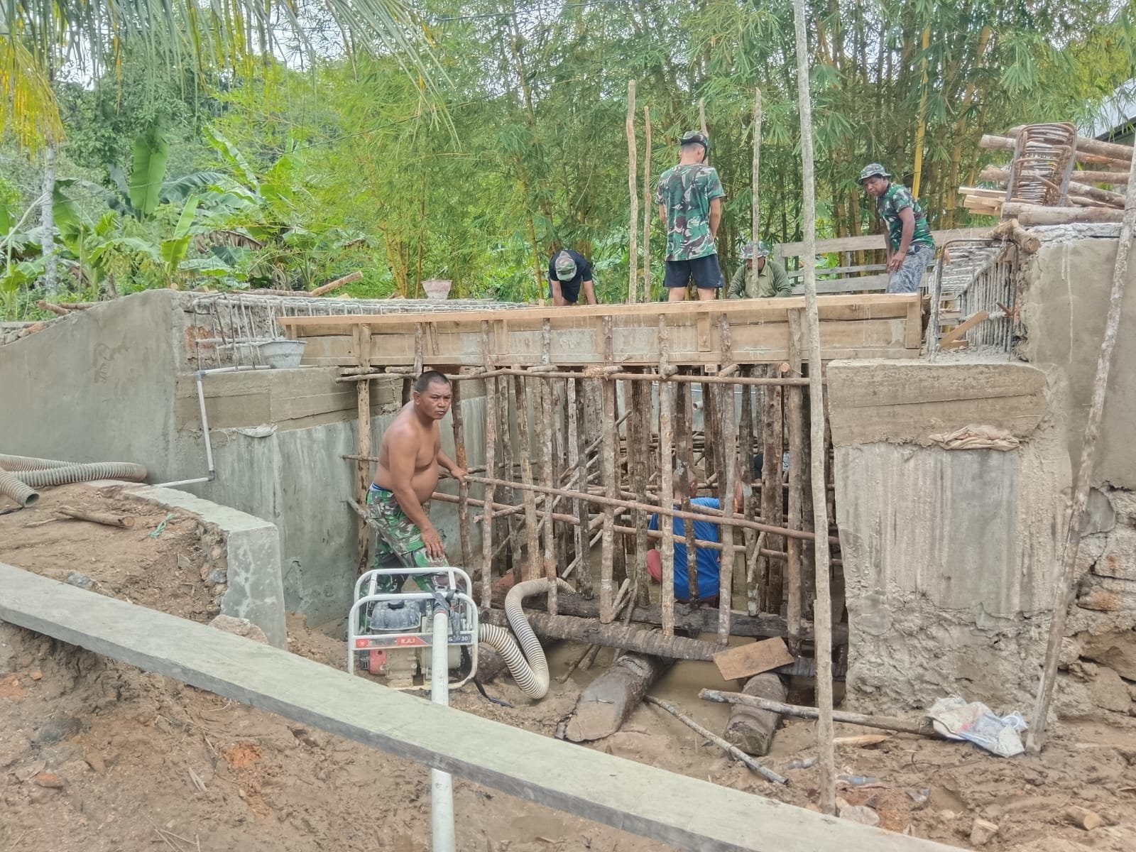 Pada tahap ini, prajurit TNI terlihat teliti memasang kayu penahan mal cor sebagai penyangga utama sebelum proses pengecoran lantai dilakukan. Penyusunan rangka kayu dilakukan dengan penuh perhitungan agar cetakan beton benar-benar presisi dan kokoh.