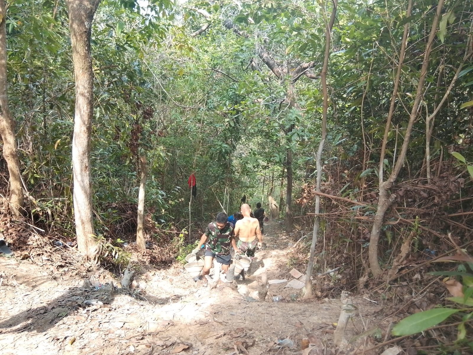 Di lapangan, personel TNI bersama warga tampak bahu-membahu mengolah campuran material seperti semen, pasir, dan kerikil sebelum dituangkan ke dalam konstruksi bak penampungan.