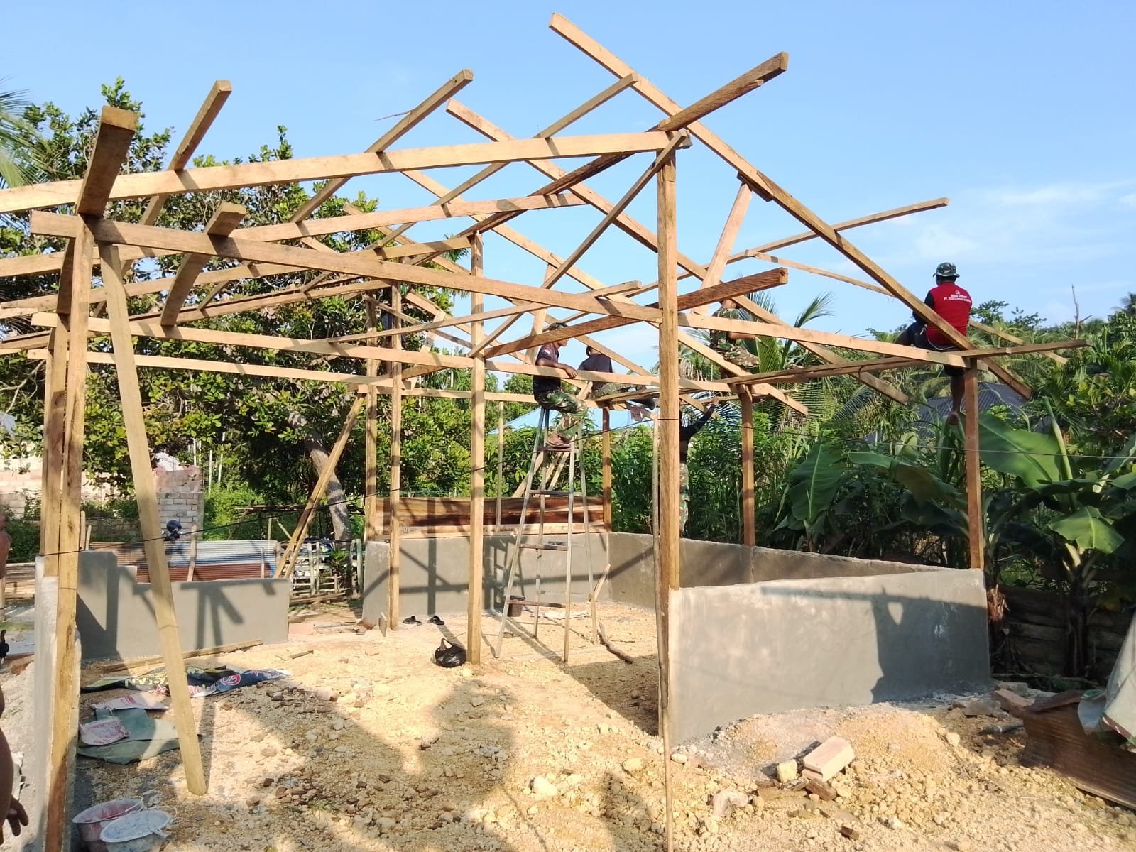Pada tahapan terbaru pembangunan, para prajurit bersama warga setempat melakukan pemasangan gelagar kayu sebagai kerangka utama atap rumah.