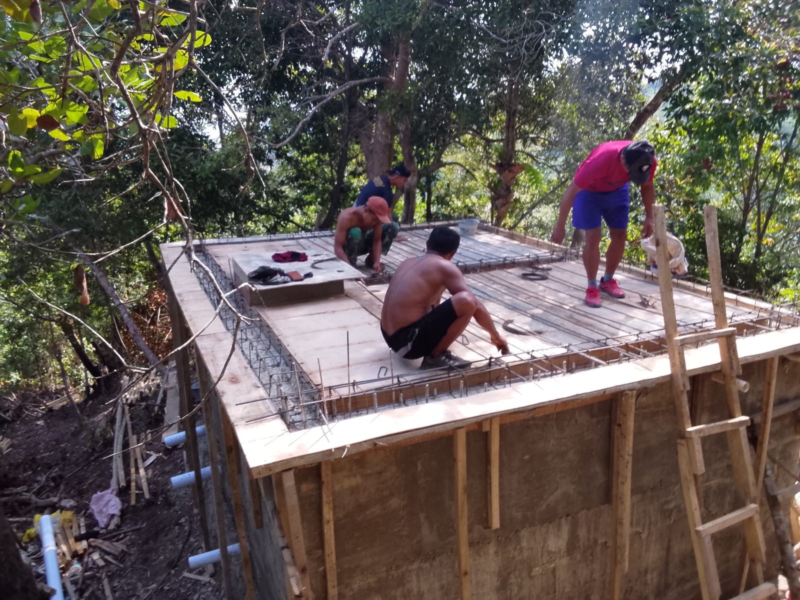 Personel Satgas TMMD bersama warga setempat bahu-membahu melanjutkan pembangunan fasilitas air bersih yang menjadi kebutuhan penting masyarakat. Pada tahap kali ini, pekerjaan difokuskan pada perakitan besi sebagai rangka utama serta persiapan pengecoran bagian penutup bak penampungan air.