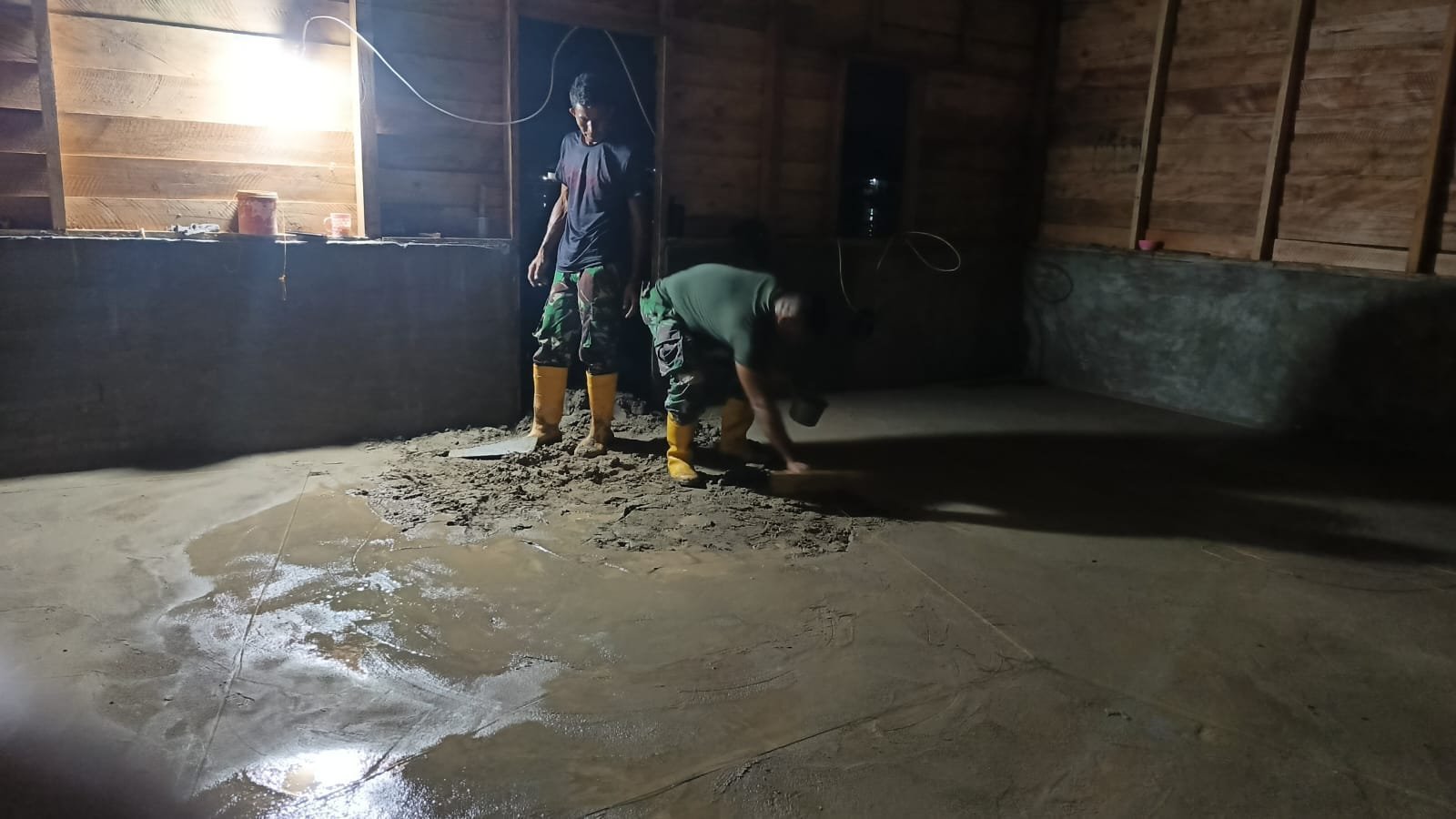 Personel Satgas TMMD bersama warga setempat bahu-membahu melakukan pengecoran lantai menggunakan campuran semen dan pasir agar menjadi lebih kokoh, bersih, dan higienis.