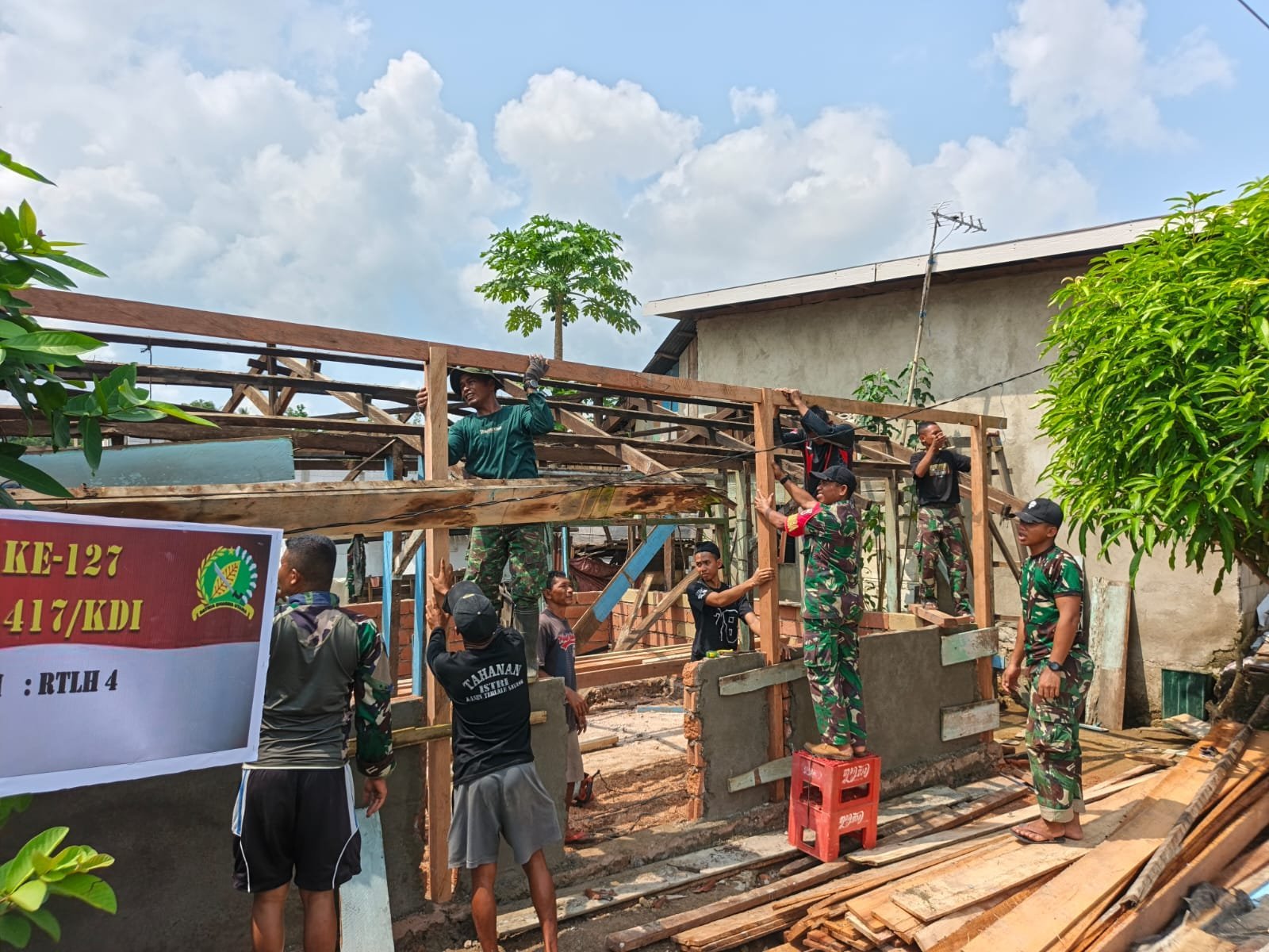 Pada tahap ini, personel Satgas mulai melakukan pemasangan rangka badan rumah untuk unit ke-4. Proses tersebut menjadi bagian penting dalam memastikan struktur bangunan berdiri kokoh sebelum masuk ke tahapan berikutnya.