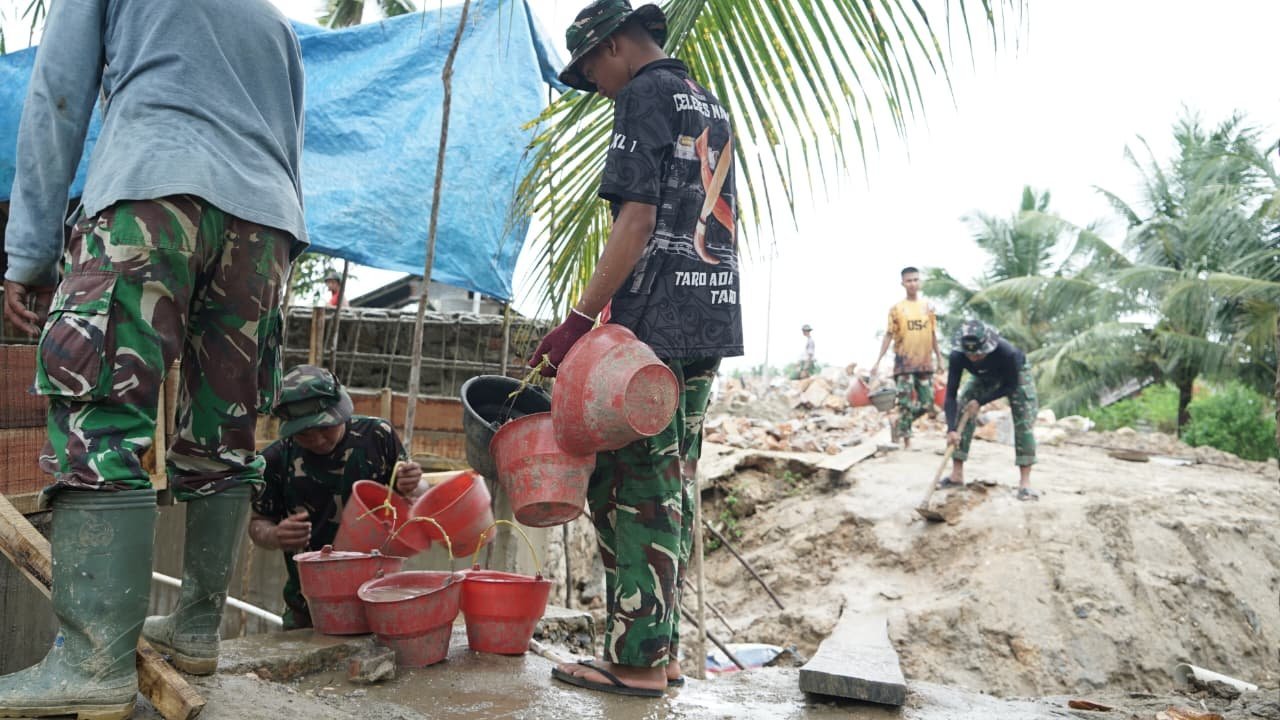 Di lokasi kegiatan, para prajurit tampak kompak memindahkan material cor secara manual untuk memastikan proses pengisian balok berjalan maksimal. Kerja sama tim menjadi kunci utama agar tahapan krusial ini tetap sesuai target.
