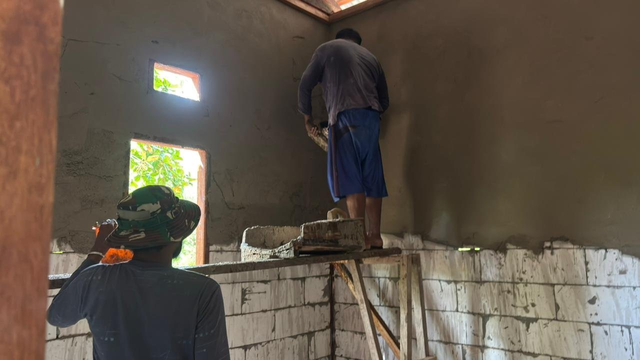 Pemasangan plester menjadi tahapan penting dalam penyempurnaan pembangunan rumah. Personel Satgas dan warga bekerja bersama memastikan hasil pekerjaan dapat memberikan kualitas bangunan yang lebih baik.