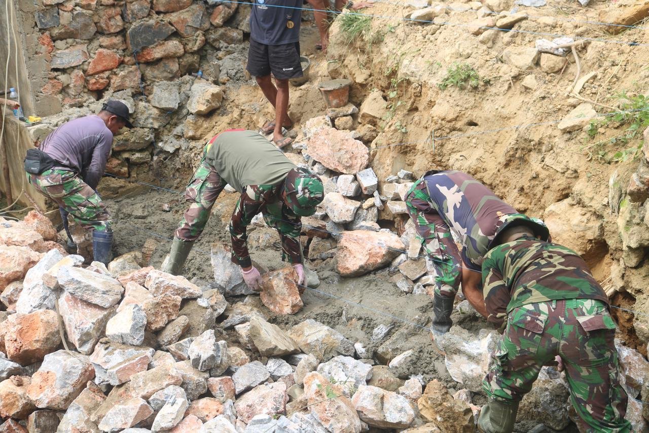 Sejak pagi hari, prajurit TNI dan warga sudah terlihat saling bahu-membahu mengangkut material serta menyelesaikan pengerjaan konstruksi yang menjadi kebutuhan vital masyarakat. Kekompakan yang terbangun membuat pekerjaan berat terasa lebih ringan.