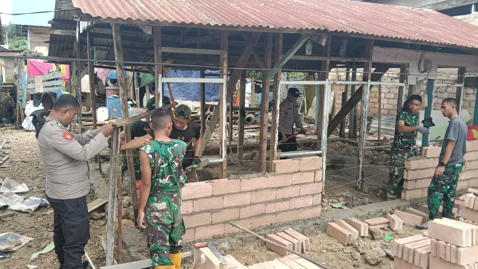 Memasuki tahap pemasangan batu bata, kedua institusi bahu-membahu menyelesaikan struktur dinding rumah warga yang menjadi sasaran program.