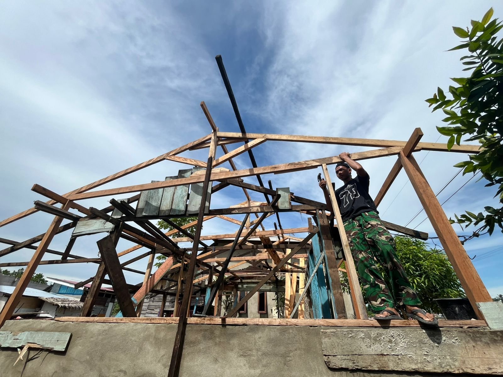 Anggota dari Kodim Kendari terlihat fokus melakukan pemasangan rangka atap dan dinding sebagai struktur utama hunian sebelum memasuki tahap finishing.