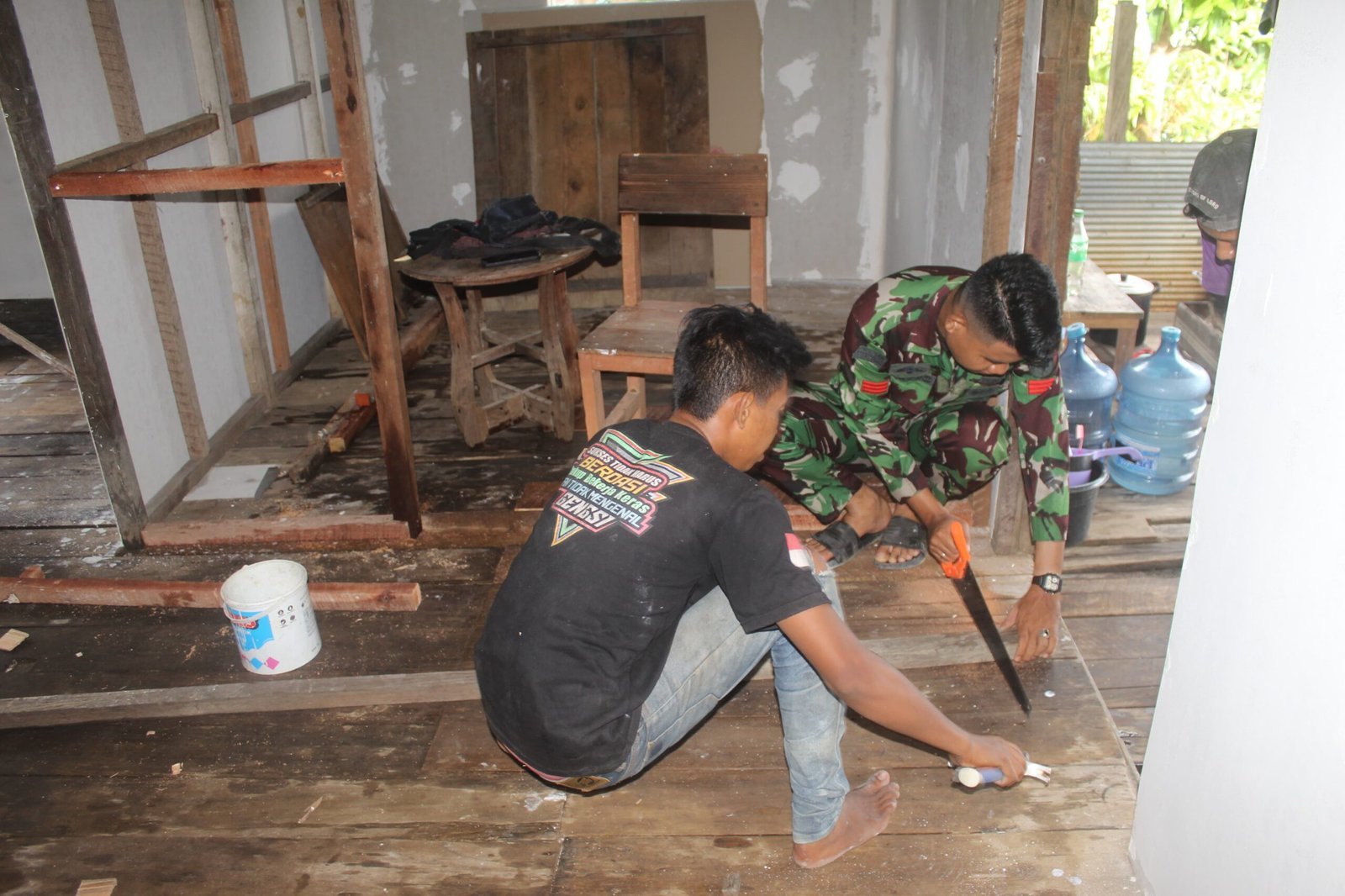 Personel TNI dan warga saling bergotong royong mengukur, memasang, dan memastikan begisting terpasang dengan kokoh di sepanjang badan jalan. Semangat kerja sama dan kebersamaan terlihat jelas di lapangan.
