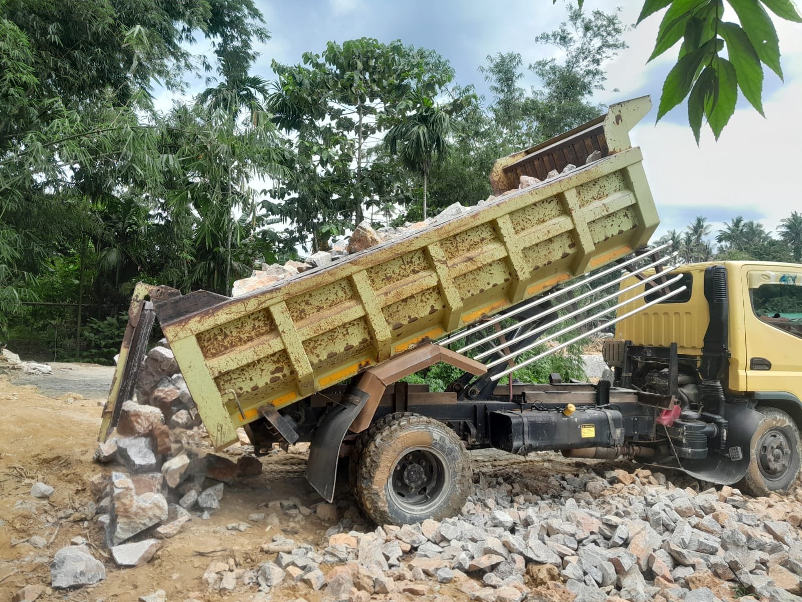 Truk pengangkut material bangunan tampak hilir mudik tanpa henti untuk menyuplai kebutuhan konstruksi seperti batu, pasir, dan semen menuju berbagai titik sasaran pekerjaan.
