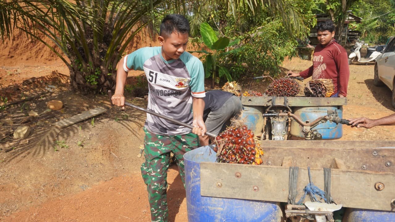 Selain membantu pembangunan infrastruktur desa, anggota TNI juga menunjukkan kepeduliannya dengan membantu warga dalam aktivitas sehari-hari, seperti mengangkut hasil panen kelapa sawit.
