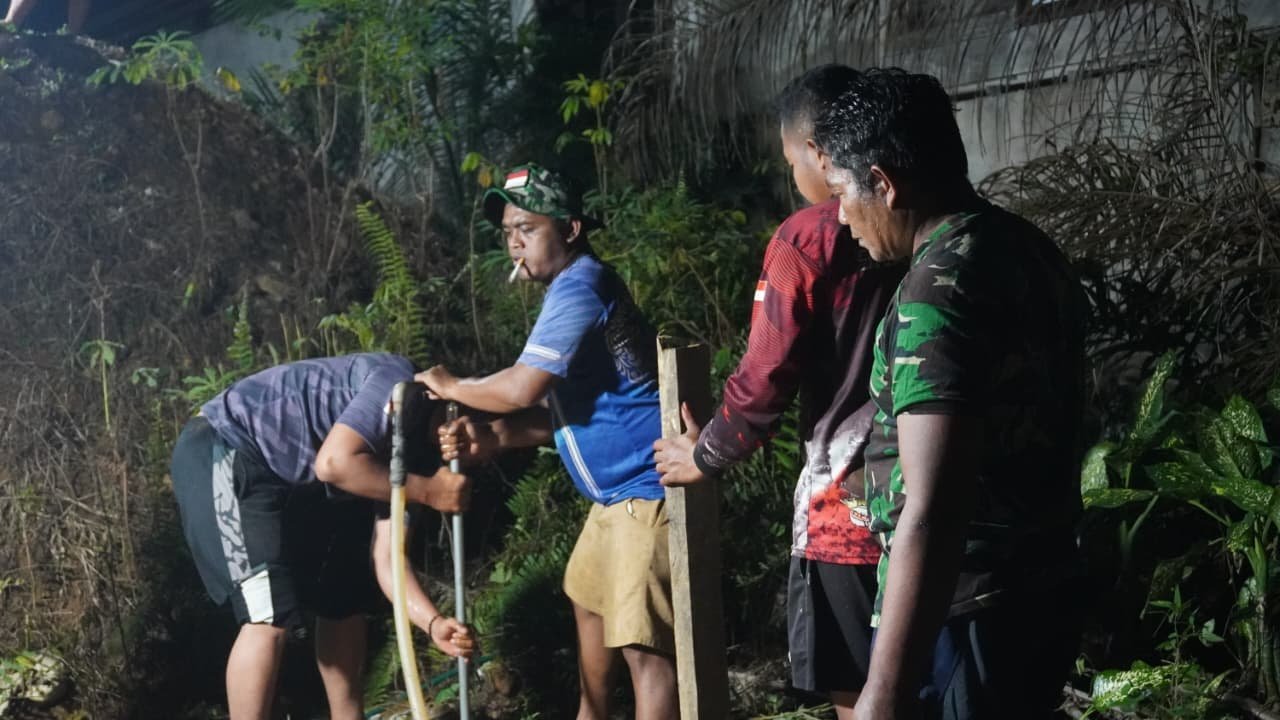 Pengerjaan sumur bor dilakukan oleh personel Satgas TMMD bersama warga secara gotong royong. Bahkan untuk mempercepat penyelesaian pekerjaan, proses pengeboran juga dilakukan hingga malam hari.