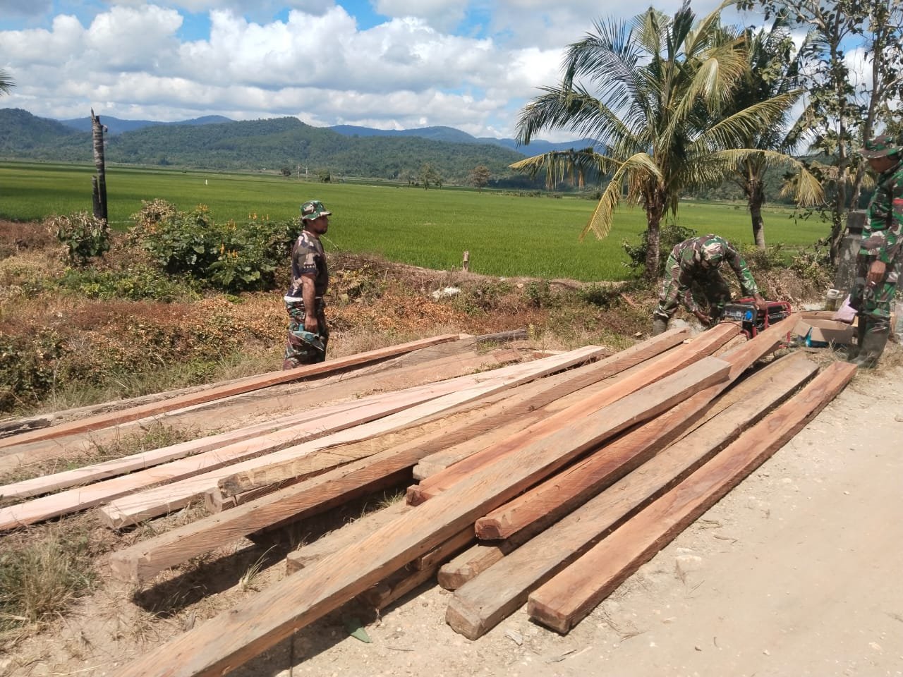Distribusi material ini menjadi simbol sinergi antara TNI dan masyarakat dalam membangun akses penghubung vital antarwilayah desa. Kayu-kayu tersebut nantinya akan digunakan untuk rangka jembatan dan alas lantai, menjadikan keberadaannya sangat penting dalam struktur utama.
